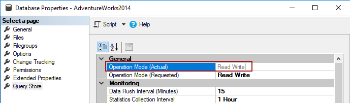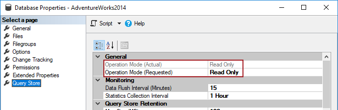 ALTER DATABASE AdventureWorks2014 SET QUERY_STORE = ON ( OPERATION_MODE = READ_ONLY ); |
