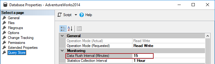 ALTER DATABASE AdventureWorks2014 SET QUERY_STORE = ON ( DATA_FLUSH_INTERVAL_SECONDS = 900 ); |