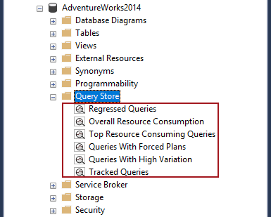 To confirm that the SQL Server Query Store is enabled on the chosen database, go to Object Explorer, refresh and expand the database. The SQL Server Query Store folder will appear with the list of available built-in reports: