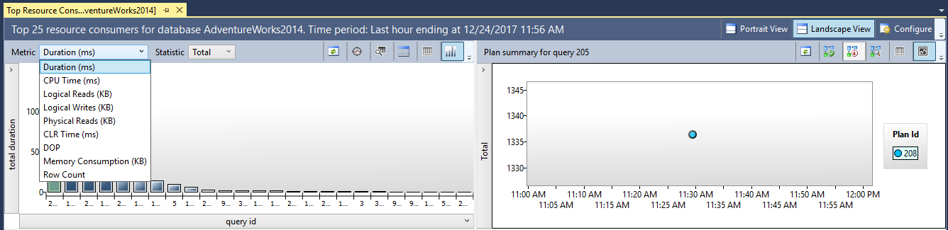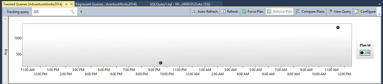With the Tracked Queries built-in report, query runtime statistics and query Execution plans can be tracked for the specific query over time. In the Tracking query text box, enter the query id (e.g. 205) and press the green play button next to the Tracking query box: