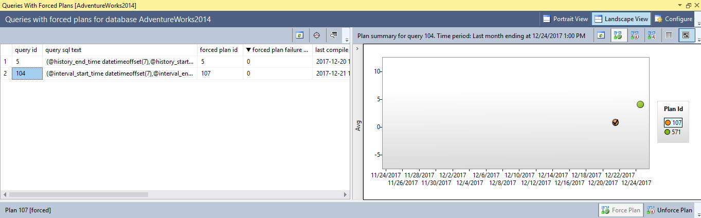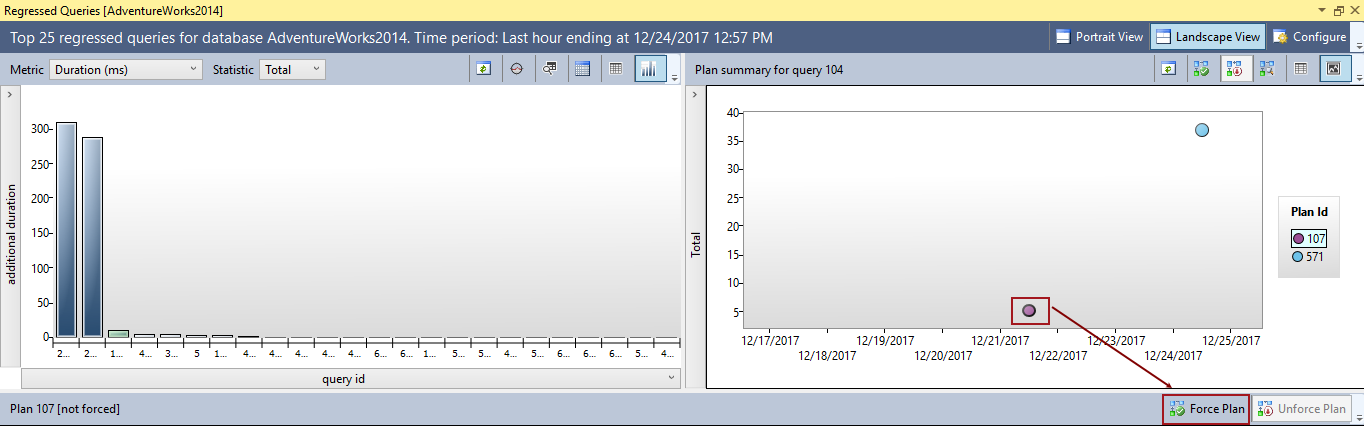 To force SQL Server to use a specific Execution Plan for the particular query, in the Regressed Queries, Top Resource Consuming Queries, Queries With Hight Variation or Tracked Queries built-in reports, first select the Execution Plan Id and click the Force Plan button: