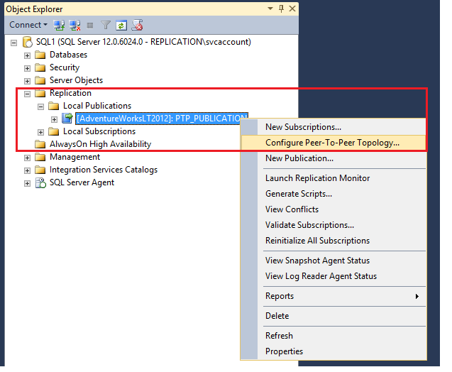 - Right-click publication and select Configure Peer to Peer topology