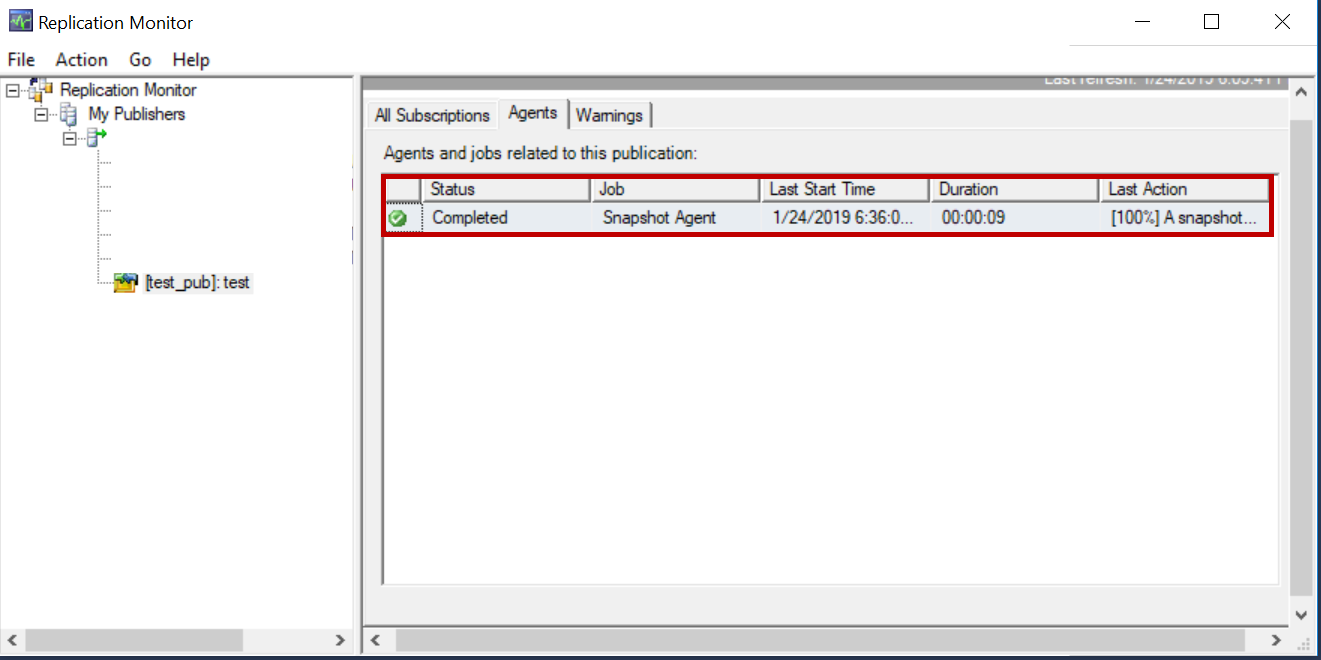 Once the table is added to publication, create a snapshot agent for the publication “test”.