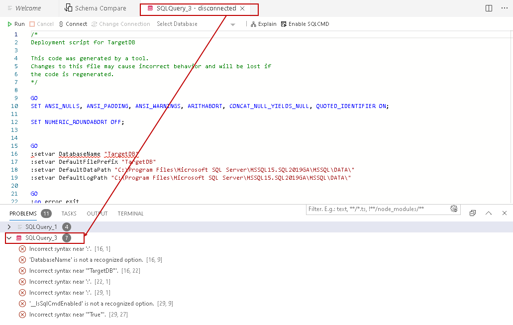 It is an SQLCMD code, and SQL Server does not recognize it. We can execute this script in SQLCMD mode only. Click on Enable SQLCMD as highlighted below. It changes the option from Enable SQLCMD to Disable SQLCMD: