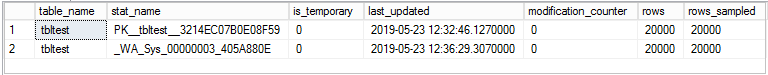SELECT Object_name(s.object_id) AS table_name, s.NAME AS stat_name, s.is_temporary, ds.last_updated, ds.modification_counter, ds.rows, ds.rows_sampled FROM sys.stats AS s (nolock) CROSS apply sys.Dm_db_stats_properties(s.object_id, s.stats_id) AS ds WHERE Object_name(s.object_id) = 'tbltest' |