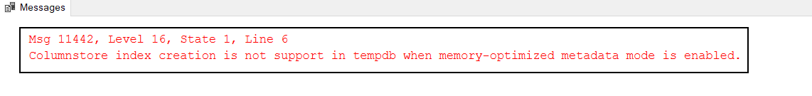 At first, we created a local temporary table that name is #temp1, and when we tried to create a columnstore index to it, we could not succeed because the memory-optimized metadata feature is enabled.
