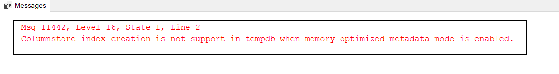 Stored Procedure, sp_estimate_data_compression_savings calculates the estimated compression gains for the tables before to compress operation. However, when we enabled the Memory-Optimized TempDB Metadata option, this procedure does not work for the t1 table because it includes a columnstore index.