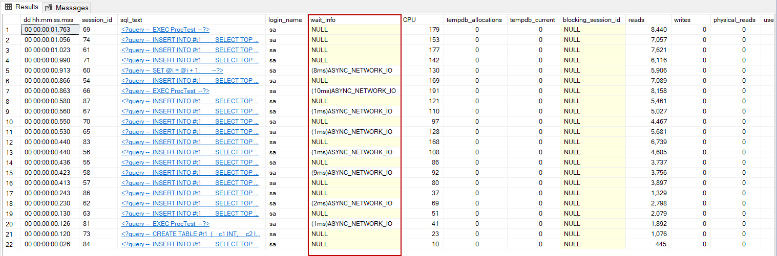 While SQLQueryStress is performing the queries, we are executing sp_WhoisActive and analyze the result of the wait_info column.