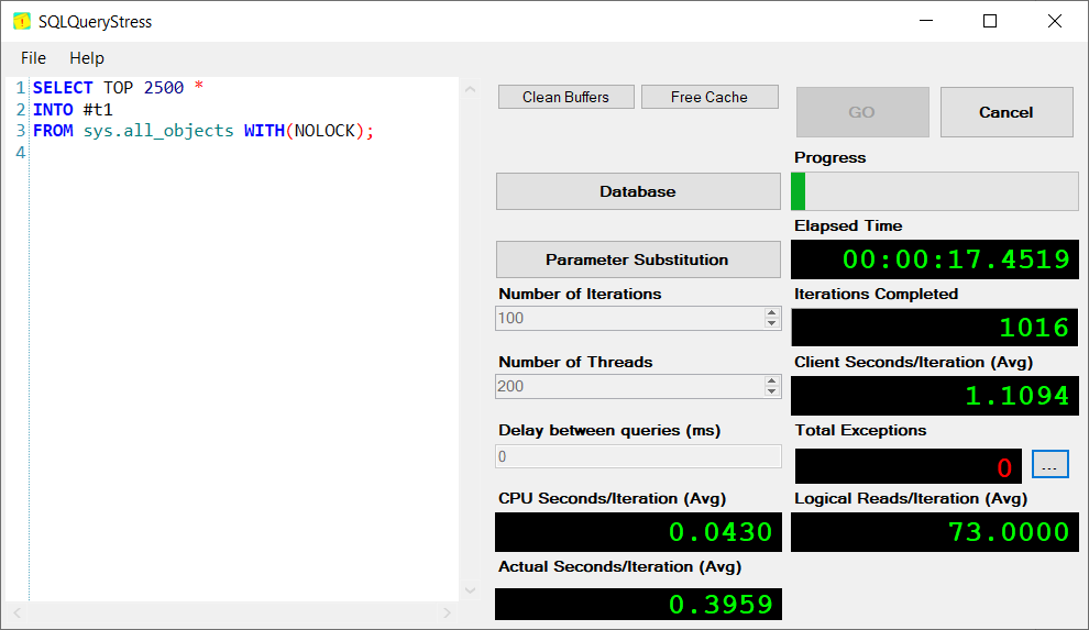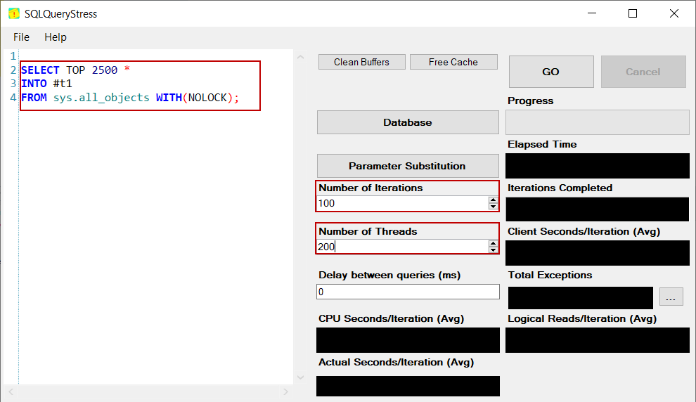 123SELECT TOP 2500 *INTO #t1FROM sys.all_objects WITH(NOLOCK); We will set the Number of Iterations as 100 and set Number of Threads as 200: