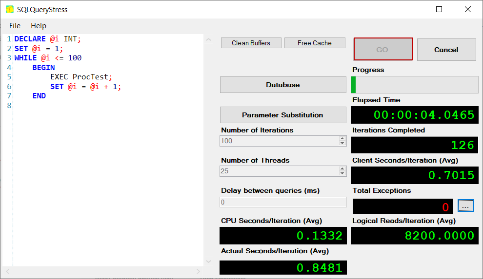We will launch the SQLQueryStress and paste the following query into the query panel. This query executes the ProcTest stored procedure 100 times in a WHILE loop.