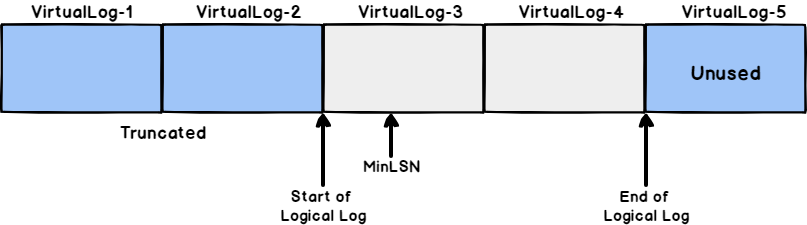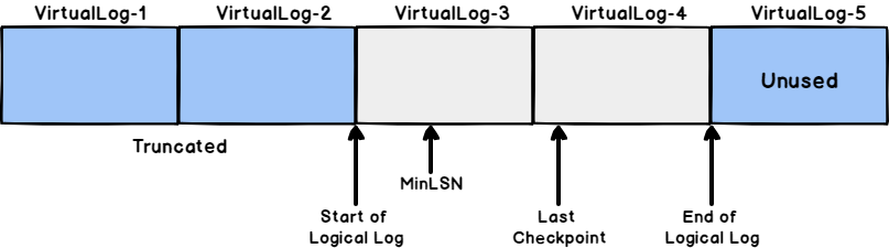 - Logical log, which is the used part of the physical log, occupies the first four VLFs