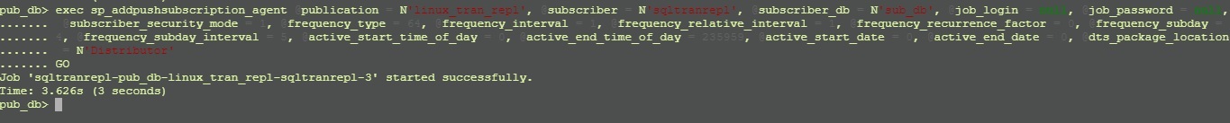 USE pub_db GO EXEC sp_addpushsubscription_agent @publication = N'linux_tran_repl', @subscriber = N'sqltranrepl', @subscriber_db = N'sub_db', @job_login = null, @job_password = null, @subscriber_security_mode = 1, @frequency_type = 64, @frequency_interval = 1, @frequency_relative_interval = 1, @frequency_recurrence_factor = 0, @frequency_subday = 4, @frequency_subday_interval = 5, @active_start_time_of_day = 0, @active_end_time_of_day = 235959, @active_start_date = 0, @active_end_date = 0, @dts_package_location = N'Distributor' |