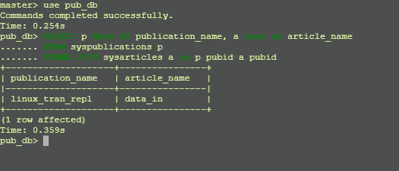 use pub_db GO SELECT p.Name AS publication_name, a.name as article_name FROM syspublications p INNER JOIN sysarticles a on p.pubid=a.pubid GO |