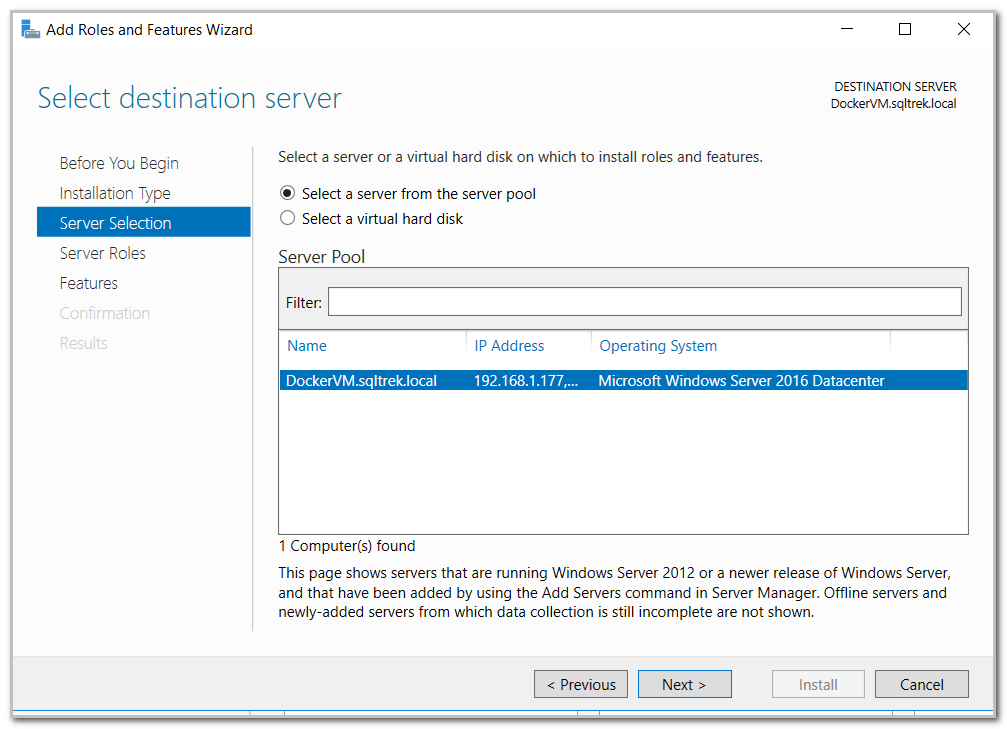 Open server manager and navigate to “Add roles and features” and select “Containers” feature as shown below.