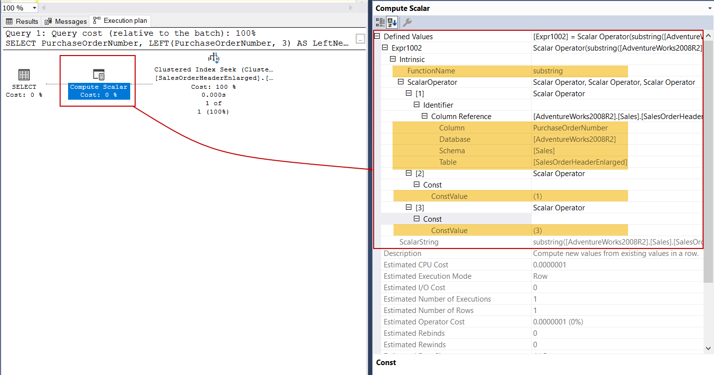 This execution plan has shown us that the RIGHT function characteristic differs from the LEFT function because the FunctionName property indicates the right value.