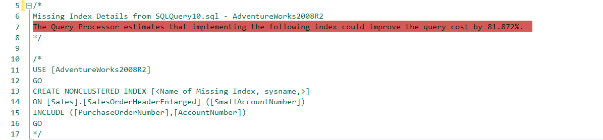 I/O statistics of the Clustered Index Operator do not change but query optimizer surprises us and offers a missing index that can improve the performance query. When we open the details of the index recommendation, it has a very pretentious proposal. Did you notice, the missing index says that this index will increase the performance of the query by 81%. It is worth trying.