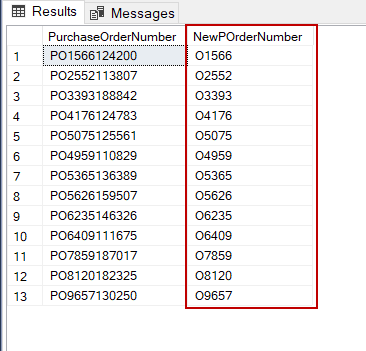 SELECT PurchaseOrderNumber, SUBSTRING(PurchaseOrderNumber, 2, 5) AS NewPOrderNumber FROM Sales.SalesOrderHeader WHERE SalesOrderID BETWEEN 43682 AND 43694 |
