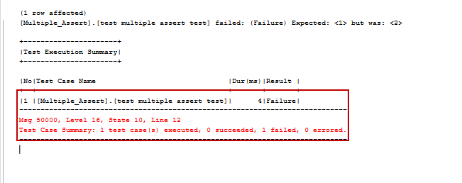 Our sample SQL unit test includes more than one assert, but this type of usage is not recommended because when the first test case fails, we don t have any idea following test case results for this reason if it is possible we have not used to multiple asserts in the SQL unit test. Now, we will prove it with a very simple example and then we will fix our example.