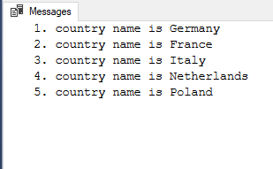 USE tempdb GO DECLARE @Counter INT , @MaxId INT, @CountryName NVARCHAR(100) SELECT @Counter = min(Id) , @MaxId = max(Id) FROM SampleTable WHILE(@Counter IS NOT NULL AND @Counter <= @MaxId) BEGIN SELECT @CountryName = CountryName FROM SampleTable WHERE Id = @Counter PRINT CONVERT(VARCHAR,@Counter) + '. country name is ' + @CountryName SET @Counter = @Counter + 1 END |