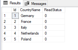 USE tempdb GO DROP TABLE IF EXISTS SampleTable CREATE TABLE SampleTable (Id INT, CountryName NVARCHAR(100), ReadStatus TINYINT) GO INSERT INTO SampleTable ( Id, CountryName, ReadStatus) Values (1, 'Germany', 0), (2, 'France', 0), (3, 'Italy', 0), (4, 'Netherlands', 0) , (5, 'Poland', 0) SELECT * FROM SampleTable |