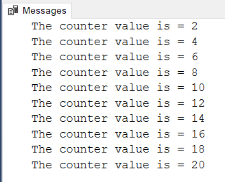 DECLARE @Counter INT SET @Counter=1 WHILE ( @Counter <= 20) BEGIN IF @Counter % 2 =1 BEGIN SET @Counter = @Counter + 1 CONTINUE END PRINT 'The counter value is = ' + CONVERT(VARCHAR,@Counter) SET @Counter = @Counter + 1 END |