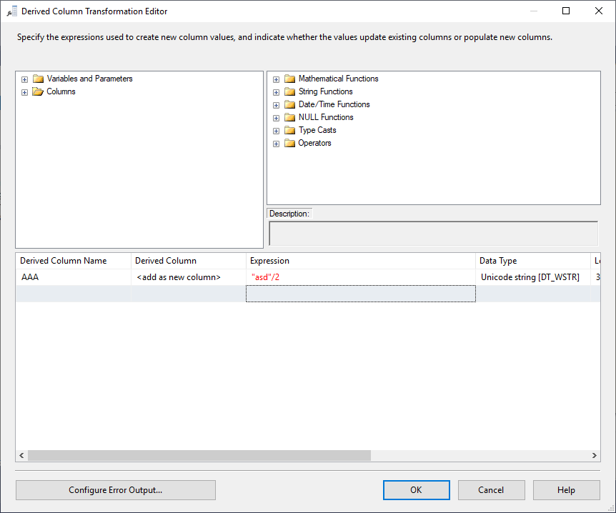 In this article, we have considered error output configuration as a part of SSIS Derived Column Transformation since it is required to implement many popular use cases such as TRY_PARSE SQL function (will be described in the next section).