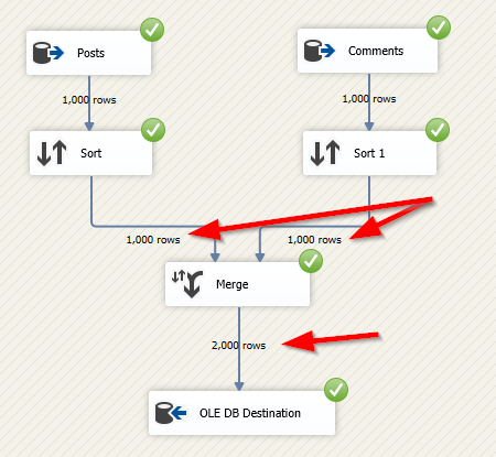 After executing the package, we can note that the count of Merge transformation output rows is equal to the sum of both input rows.