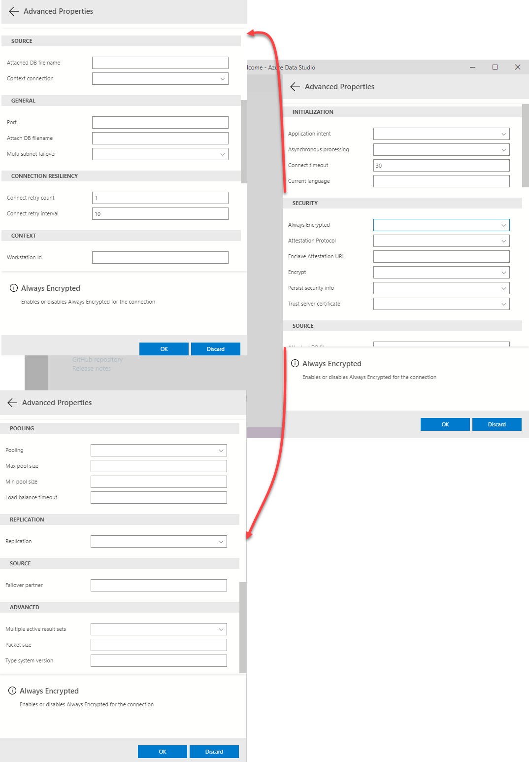 Azure Data Studio provides you with the ability to configure a large number of options that can be used to customize the connection to the specified SQL Server instance, as shown below: