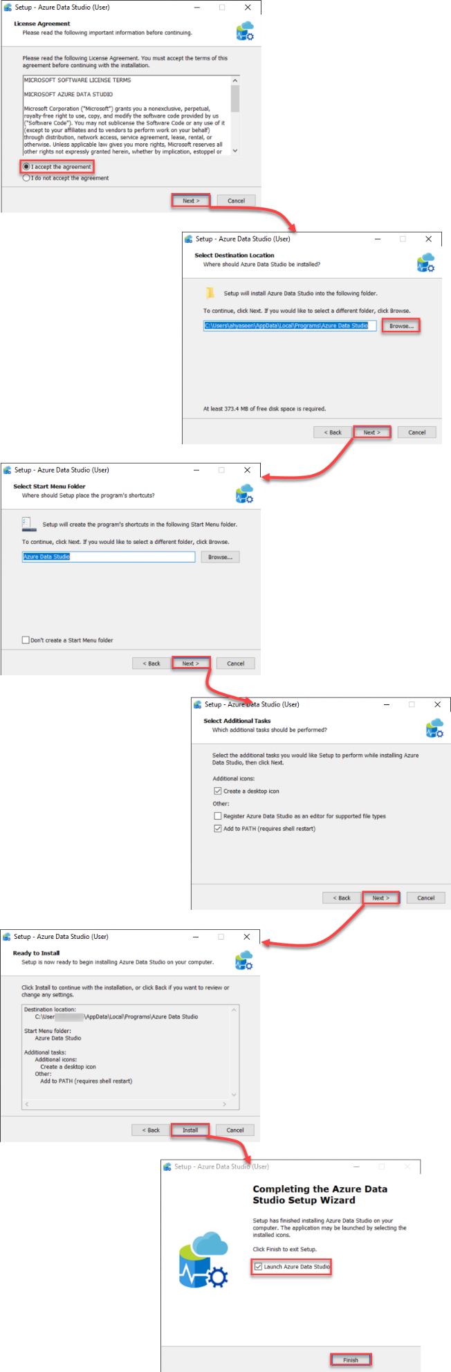 Once downloaded, Azure Data Studio can be installed to your machine using the straight-forward installation wizard, in which you will be requested to accept the license agreement, specify the installation path, whether to create a folder for the tool shortcut under the start menu and finally configure several additional tasks for that tool. After installing the tool successfully, the wizard will notify you that the installation is completed without any issue and will ask you whether to launch the tool directly, as shown below: