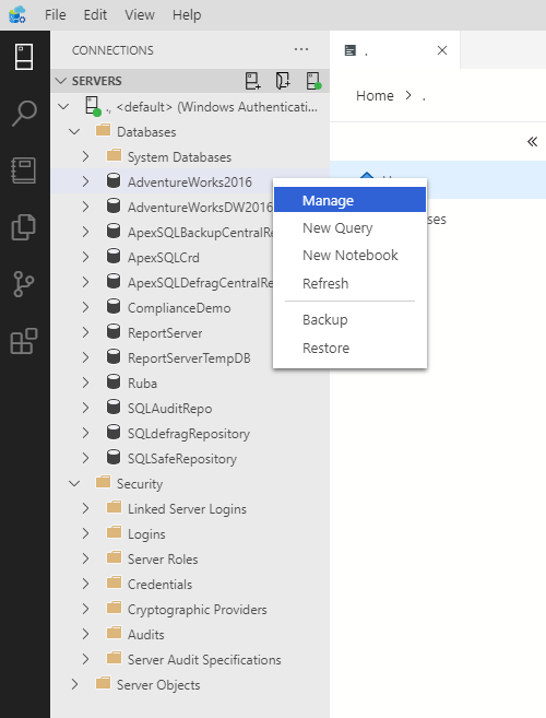 Azure Data Studio provides you with the ability to perform most of the data related tasks that you used to perform with the SSMS. For example, after connecting to a specific SQL Server instance and listing all available databasesunder that instance, right-click on your database and click the Manage option, as shown below: