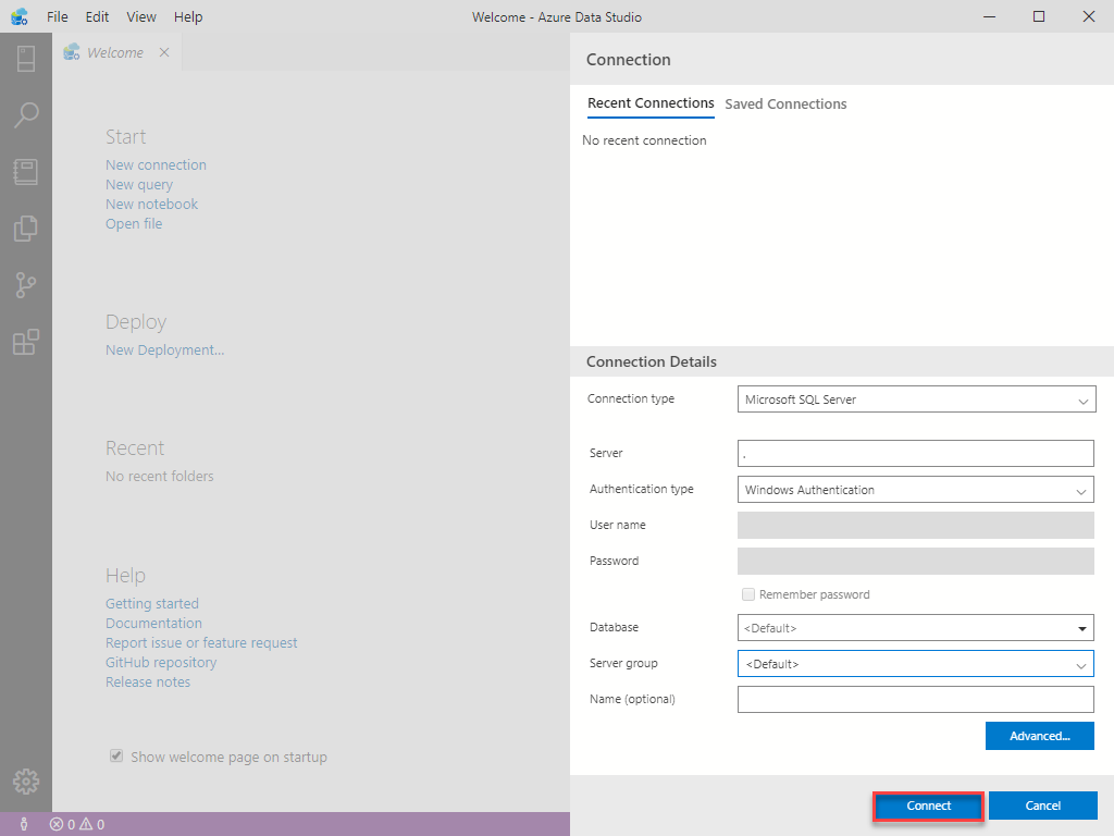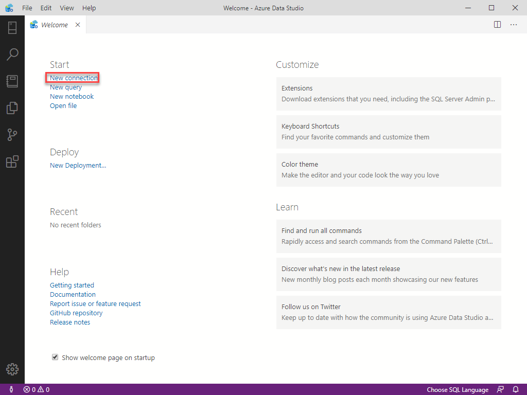 If you launch Azure Data Studio, the first page that will be displayed is the Welcome page, which contains the main tasks that you can perform using that studio. This includes starting a new connection to the database instance, write a new query, create a new notebook, opening an existing file, creating a new deployment, and getting help from Microsoft regarding that tool.