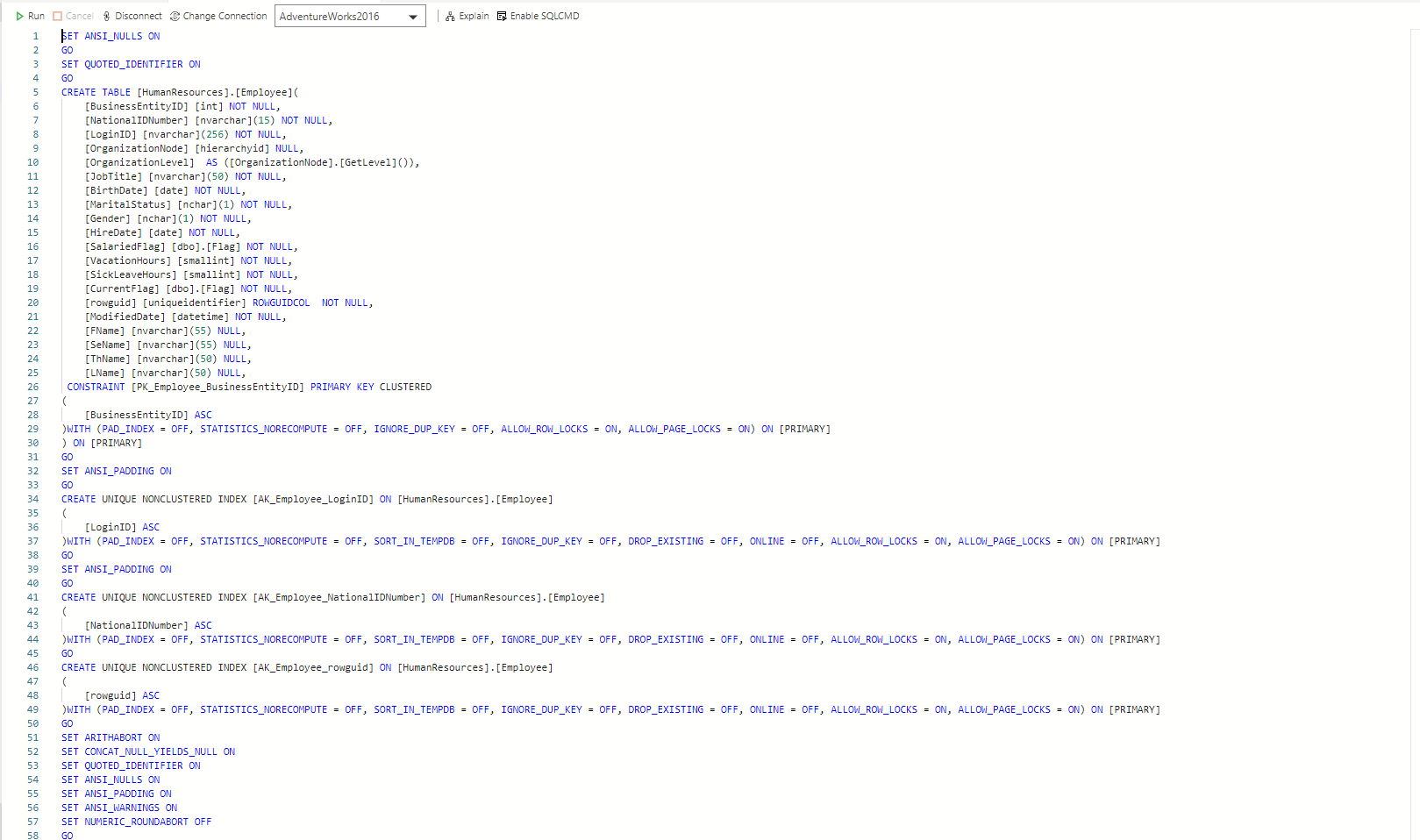 And the last, but not least, option from the Manage Database objects window is Script as Create option, which can be used to generate the T-SQL script that can be used to create the selected database object, as shown below: