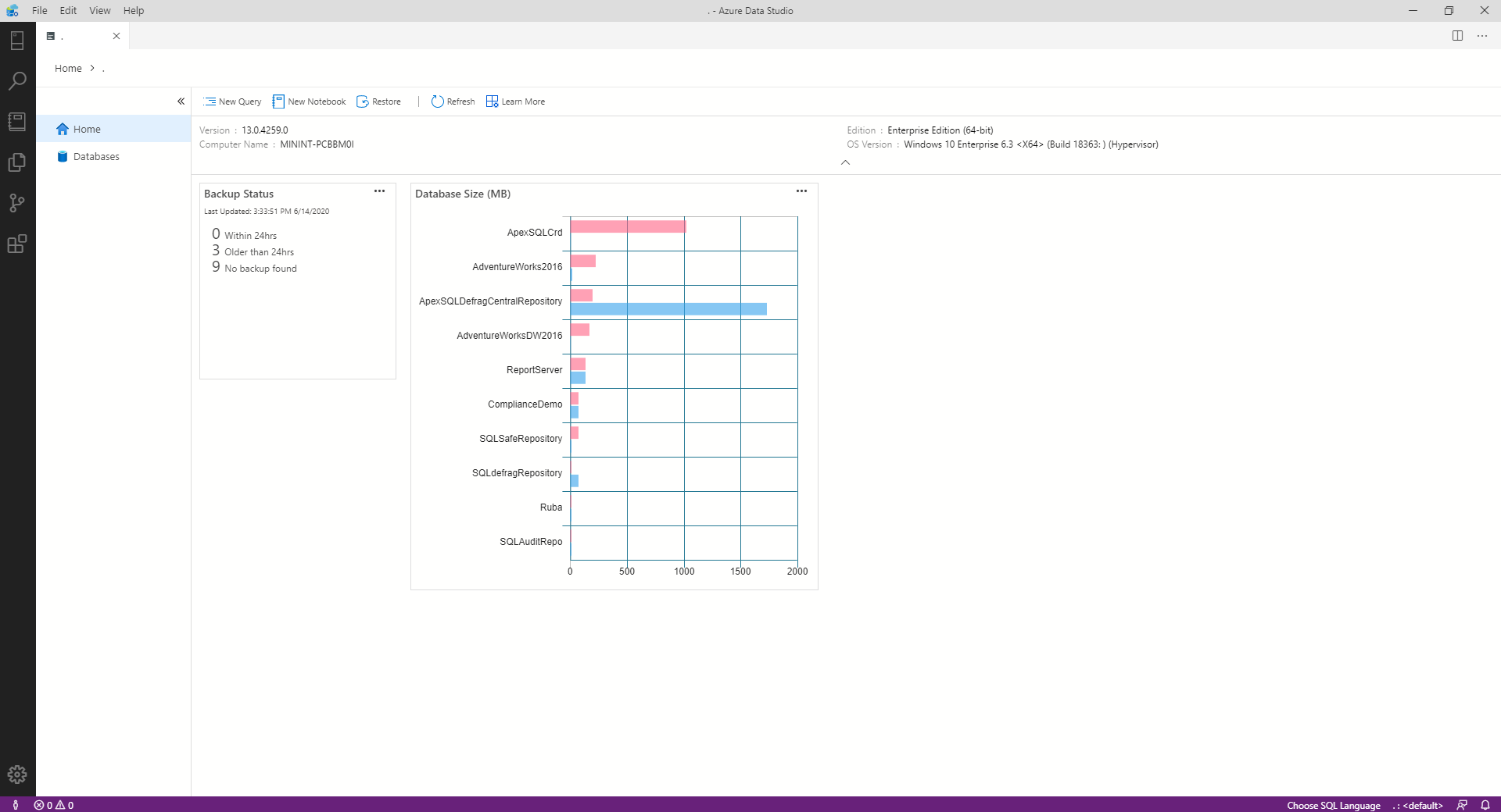 The first window that will be displayed is the Home page, that contains a summarized view for that SQL Server instance. This includes general information about the SQL Server version and edition, in addition to the name and OS version of the hosting machine.