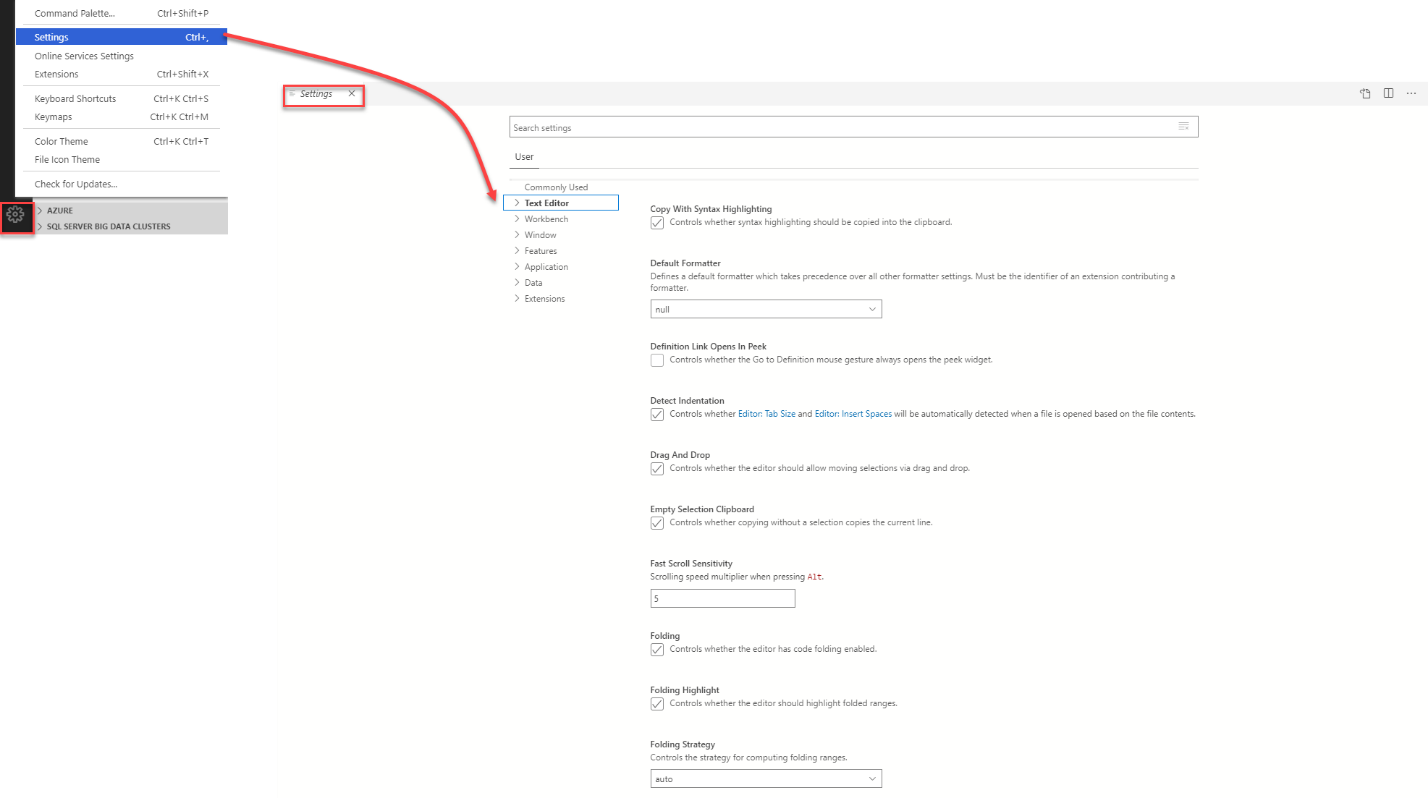 Azure Data Studio can be customized using a wide range of options that can be used to meet your requirements. This can be achieved by providing the proper value for each option from the Settings page, as shown below:
