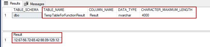 DROP TABLE IF EXISTS TempTableForFunction DROP TABLE IF EXISTS TempTableForFunctionResult GO CREATE TABLE TempTableForFunction (SampleVal Float) INSERT INTO TempTableForFunction VALUES (12.67) , (98.09),(65.42),(56.72),(129.12) SELECT STRING_AGG(SampleVal,'-') WITHIN GROUP ( ORDER BY SampleVal ASC) AS Result INTO TempTableForFunctionResult FROM TempTableForFunction SELECT TABLE_SCHEMA,TABLE_NAME,COLUMN_NAME,DATA_TYPE,CHARACTER_MAXIMUM_LENGTH FROM INFORMATION_SCHEMA.COLUMNS WHERE TABLE_NAME='TempTableForFunctionResult' SELECT STRING_AGG(SampleVal,'-') WITHIN GROUP ( ORDER BY SampleVal ASC) AS Result FROM TempTableForFunction |