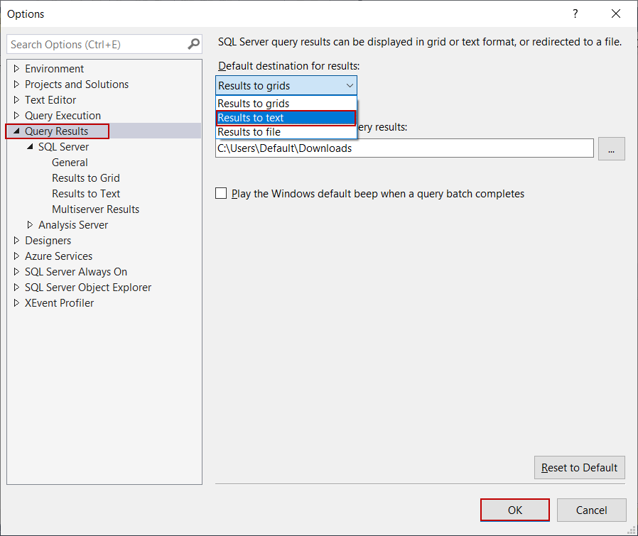 As we can see, we did not obtain the result that we wished in the SQL Server Management Studio result tab. In fact, it misleads us in SSMS because of the query result option. We will change this option in SSMS so that we achieve the proper visual. We will find the Options setting under the Tools menu and then change the Default destination for result option in the Query Results setting. We will change the Results to grids option to Result to text: