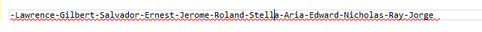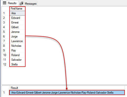 SELECT FirstName FROM PersonTestTable SELECT STRING_AGG(FirstName,'-') AS Result FROM PersonTestTable |