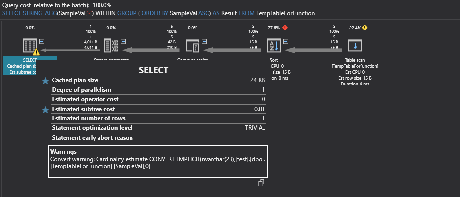 The sort operation is processed before the Stream Aggregate operation so the numbers are sorted out properly. On the other hand, there is a warning sign shown over the SELECT image. If we hover over this image, we can find out more details about this issue:
