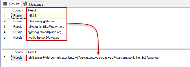 SELECT Country,Mail Result FROM [PersonTestTable] where country='Russia' group by Country, Mail SELECT Country, STRING_AGG(Mail,',') WITHIN GROUP ( ORDER BY Mail ASC) AS Result FROM [PersonTestTable] where country='Russia' group by Country |