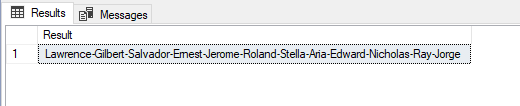 SELECT FirstName FROM [PersonTestTable] ORDER BY FirstName ASC GO SELECT STRING_AGG(FirstName,'-') WITHIN GROUP ( ORDER BY FirstName ASC) AS Result FROM [PersonTestTable] |