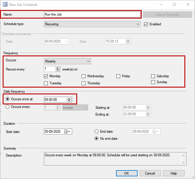 On the New Schedule dialog box, enter the desired schedule name in Name textbox choose weekly from the occurs drop-down box click on Monday checkbox enter 09:00:00 in Occurs once at the textbox. See the following screenshot