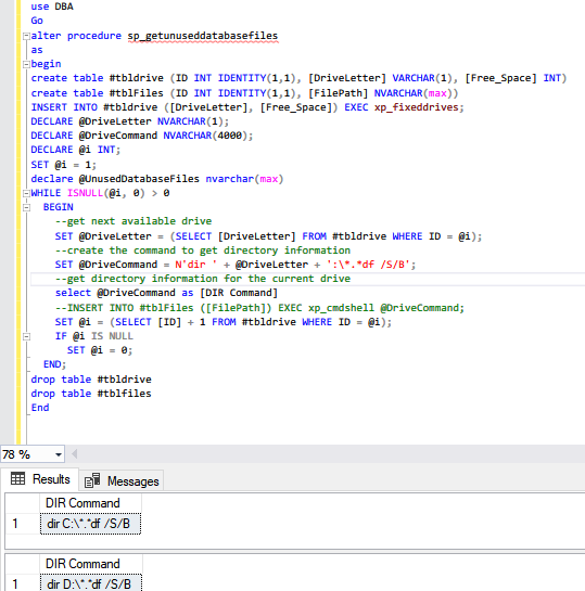 To insert the list of the physical location of in temp table, we must create a dynamic T-SQL query that uses the drive letters stored in #tbldrive and create a dir command. In the dir command, we are going to use /S /B flags. The /S /B returns the full path of the files with *.mdf and *.ldf extensions. The following code generates the dir command.