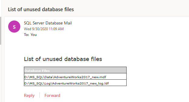 To send the email, we will use the SQL Server database mail. I have already created a database mail profile named OutlookMail. The code to email the list of unused database files is as following: