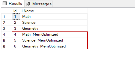 Let’s try to execute the Usp_InsertLessonMemOpt procedure with memory-optimized table-valued parameter.