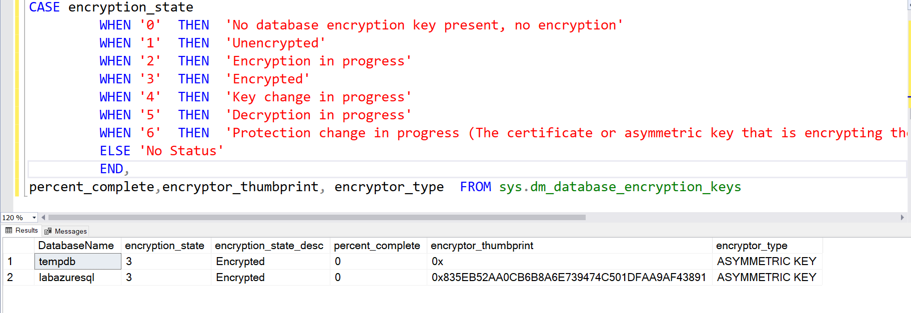 SELECT DB_NAME(database_id) AS DatabaseName, encryption_state, encryption_state_desc = CASE encryption_state WHEN '0' THEN 'No database encryption key present, no encryption' WHEN '1' THEN 'Unencrypted' WHEN '2' THEN 'Encryption in progress' WHEN '3' THEN 'Encrypted' WHEN '4' THEN 'Key change in progress' WHEN '5' THEN 'Decryption in progress' WHEN '6' THEN 'Protection change in progress (The certificate or asymmetric key that is encrypting the database encryption key is being changed.)' ELSE 'No Status' END, percent_complete,encryptor_thumbprint, encryptor_type FROM sys.dm_database_encryption_keys |