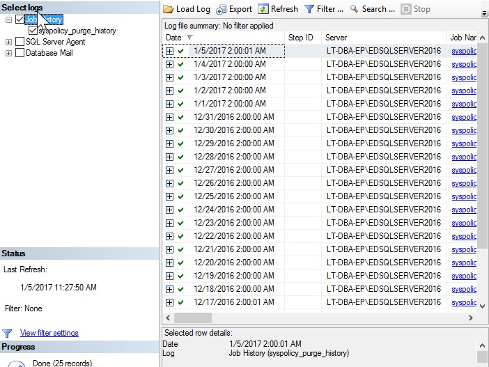 From the SQL Server Agent menu, we can click on Job Activity Monitor in order to view the up-to-the-minute status of each job. From the jobs menu, the history for all or any subset of jobs can be viewed, as well as for any single job: