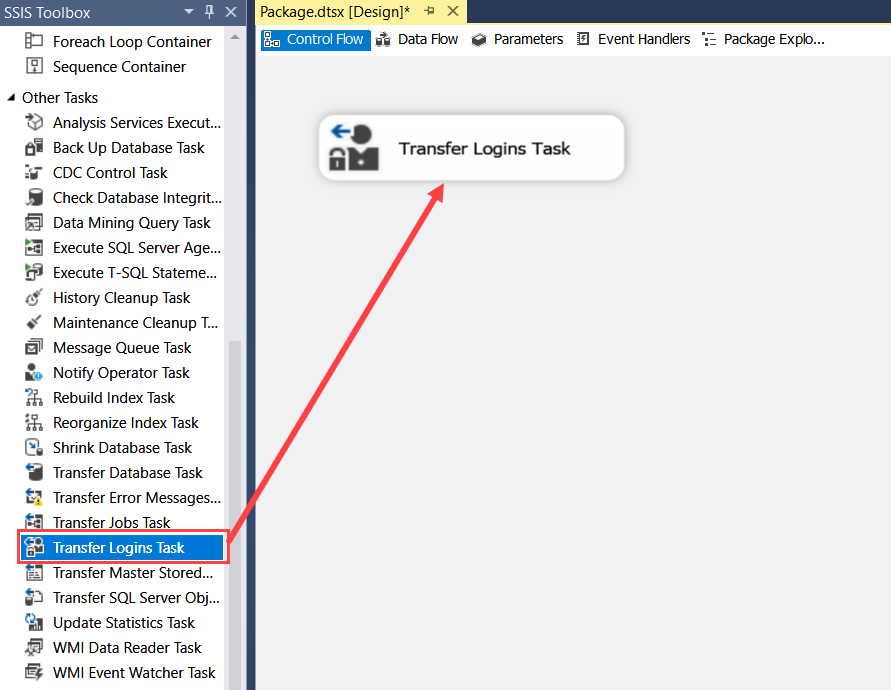 We can transfer the logins by using the Transfer Login task in the SQL Server Integration Services package. To do that, open SQL Server Data Tools 2017, create a new integration services project, and on the task flow window, drag and drop Transfer Login Task as shown below: