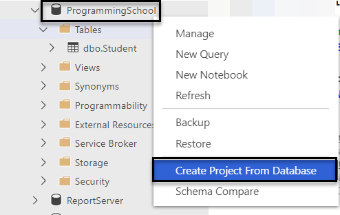 Now we need to create a SQL Database Project from this database. Right-click on the ProgrammingSchool database and click on “Create Project From Database”: