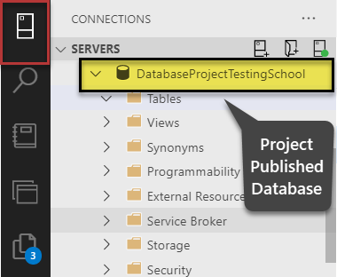 Now please locate DataseProjectTestingSchool under the Databases node to see the database created and managed by the database project: