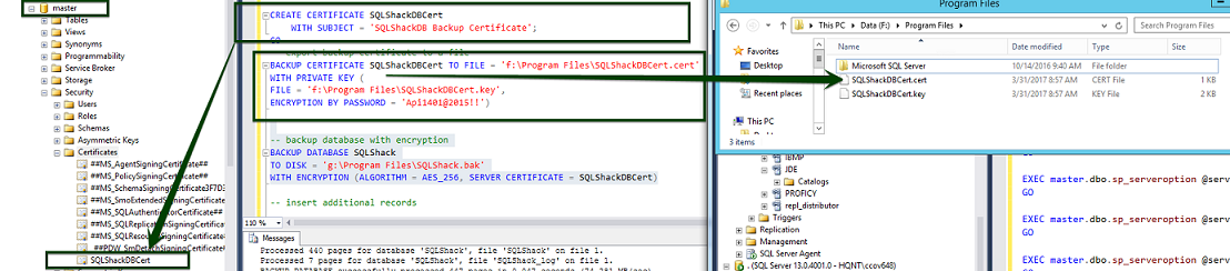 The name of the certificate file is “f:\Program Files\SQLShackDBCert.cert”. We’d also want to export the private key file, “f:\Program Files\SQLShackDBCert.key” which will encrypt the certificate file. Finally, we’ll protect the entire thing with a strong password. Let’s create the backup of the certificate at a secured offsite location